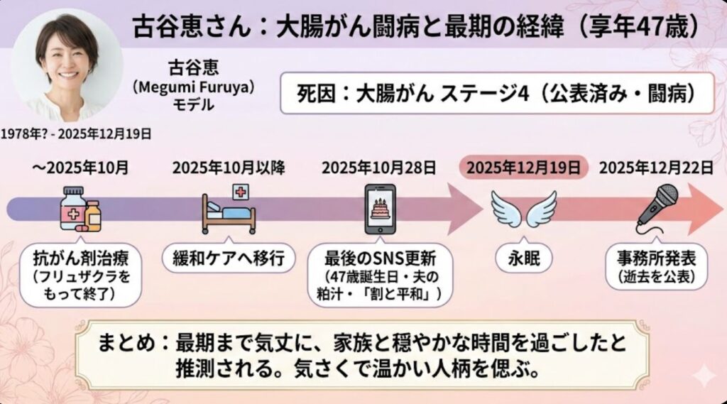 情報の流れを知ることで、彼女がどれだけ懸命に生きたかが見えてきます。古谷さんは、大腸がんのステージ4であることを公表されていました。事務所の発表やSNSの記録をまとめると、このような流れになります。