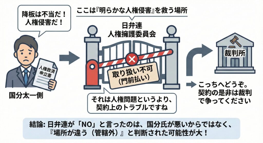 代理人のコメントには「当委員会としては取り扱うことができない」とありました。これ、法律や人権救済の現場ではかなり重い言葉です。本来、人権救済の申し立ては「誰が見ても明らかな人権侵害」がないと動きません。